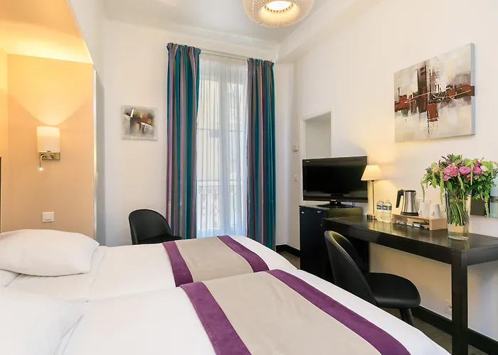 Hotel Le Meurice Nice erbjuder ett mysigt boende med kassaskåp och 24-timmars säkerhet intill Place Masséna. Plage de Passable ligger 10 minuters bilfärd från hotellet, medan Slottskullen ligger 16 minuters promenad bort.